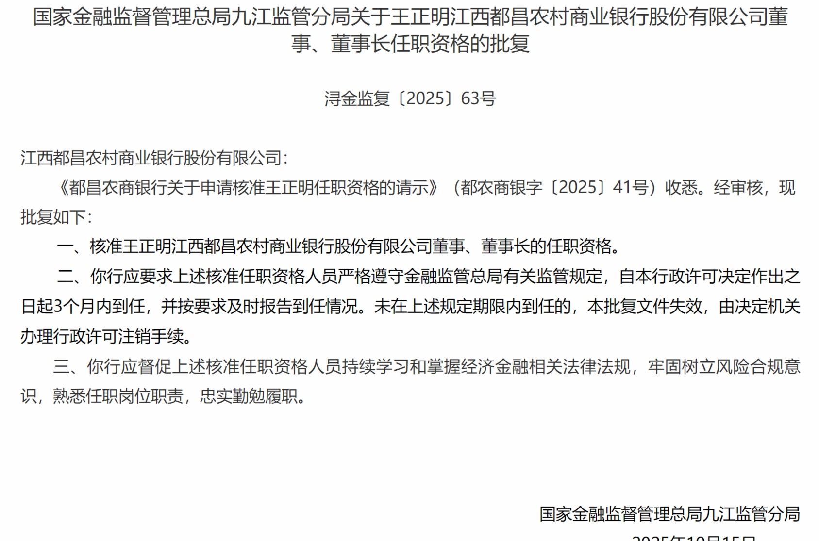 10月24日十大配资平台app下载,国家金融监督管理总局九江监管分局发布关于王正明江西都昌农村商业银行股份有限公司董事、董事长任职资格的批复,核准王正明江西都昌农村商业银行股份有限公司董事、董事长的任职资格。