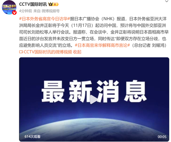 据日本广播协会(NHK)报道,日本外务省亚洲大洋洲局局长金井正彰将于今天(11月17日)起访问中国,预计将与中国外交部亚洲司司长刘劲松等人举行会谈。报道称,在会谈中,金井正彰将说明日本首相高市早苗近日的涉台发言并未改变日方一贯立场,同时传达“即便双方存在立场分歧,也应避免影响人员交流”的立场。