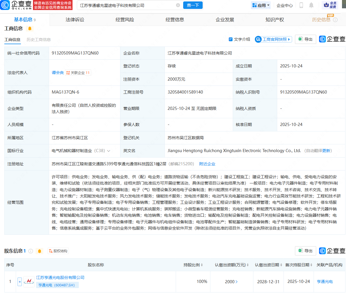 近日,江苏亨通睿充星途电子科技有限公司成立手机上买股票,法定代表人为谭会良,注册资本为2000万元,经营范围包含:电力电子元器件制造;电子专用材料制造;充电桩销售;电池销售;电池零配件生产等。企查查股权穿透显示,该公司由亨通光电(600487)全资持股。