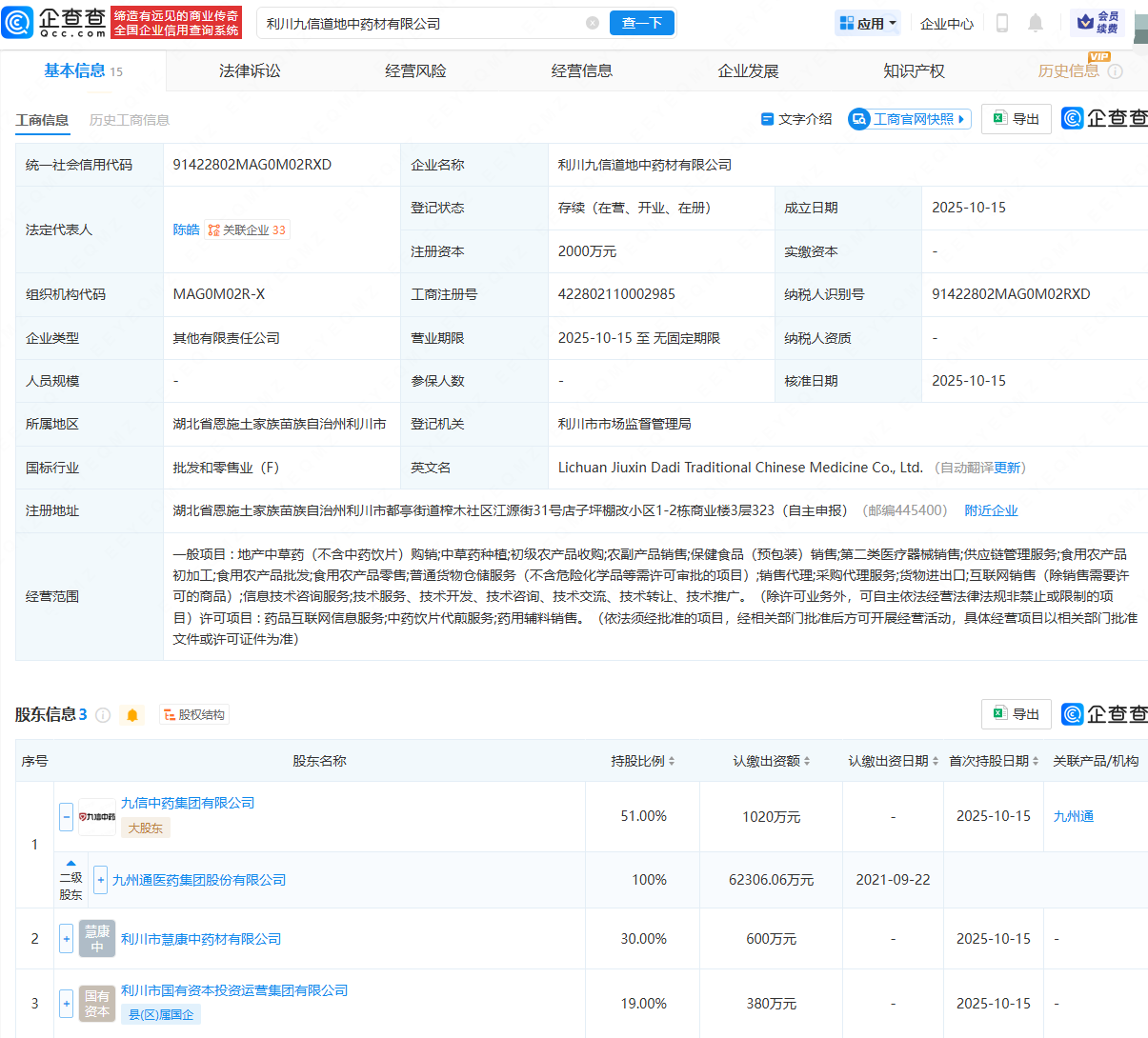 近日,利川九信道地中药材有限公司成立,法定代表人为陈皓,注册资本为2000万元短线免息配资炒股,经营范围包含:地产中草药(不含中药饮片)购销;中草药种植;初级农产品收购;农副产品销售等。企查查股权穿透显示,该公司由九州通(600998)全资子公司九信中药集团有限公司、利川市慧康中药材有限公司等共同持股。